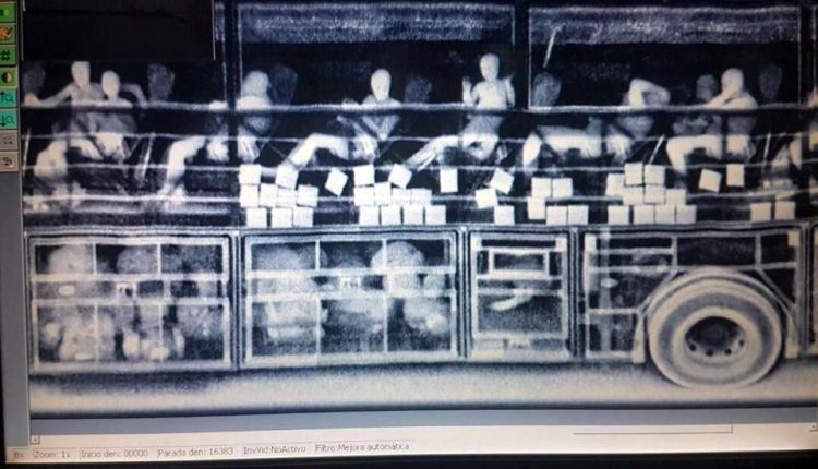 El personal naval detectó, mediante rayos Gamma, irregularidades en la estructura interna del autobús, ante lo cual, peritos encontraron 43 paquetes con dólares en efectivo, en un panel lateral del camión que estaba ensamblado a propósito para esconder los billetes envueltos y sellados en plástico resistente.