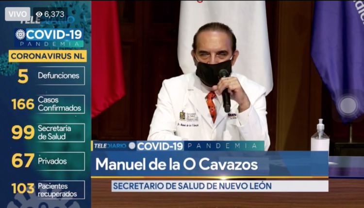 El Secretario de Salud de Nuevo León, Manuel de la O, aseguró en conferencia de Prensa que los túneles sanitizantes que están instalando alcaldes metropolitanos No son seguros, al tiempo que anunciaba que la cifra de muertos por el Nuevo Coronavirus ascendió a 5, dijo además que al día de hoy se han confirmados 166 infectados y, que al corte de este miércoles se han recuperado 103 de los pacientes infectados.