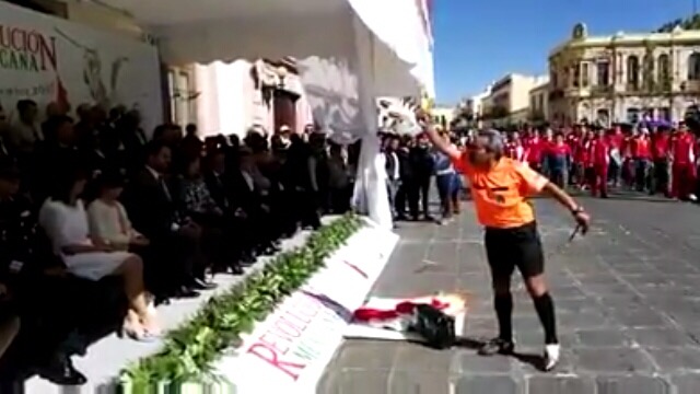 Un árbitro de fútbol que desfilaba dentro del evento cívico Revolucionario de este 20 de noviembre en Zacatecas, llegó hasta el frente del estrado donde se encontraba el Gobernador de esa entidad y le mostró a él y a su comitiva una tarjeta amarilla.