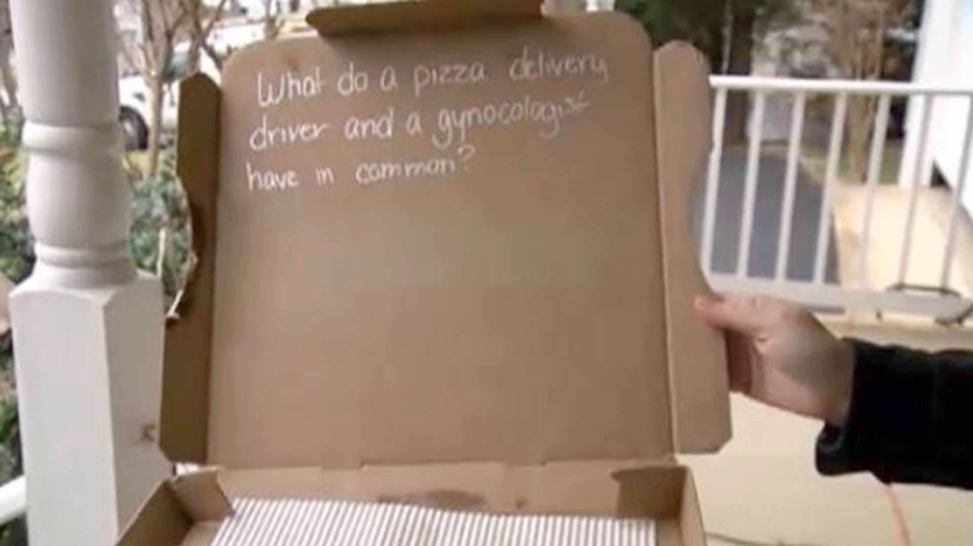 “¿Qué tienen en común un repartidor de pizza y un ginecólogo?”, escribió en en el interior de la tapa de la caja. Y la respuesta: “Ambos tienen que olerla pero ninguno de los dos puede comérsela”.