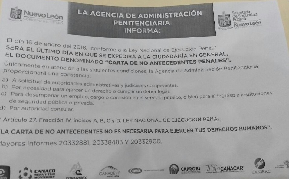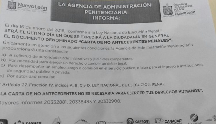 En un comunicado escueto, sin firmas y sin formalidad alguna se lee en el aviso al que se refería la servidora publica: “El 16 de Enero del 2018 conforme a la Ley Nacional de Ejecución Penal entrará el último día que se expedirá a la ciudadanía la denominada Carta de No Antecedentes Penales, Únicamente en atención a las siguientes condiciones la Agencia de Administración Penitenciaria proporcionará una constancia: A. solicitud de autoridad administrativa o judicial, B. Por necesidad para ejercer un derecho o cumplir un deber legal, C. Para desempeñar un empleo, cargo o comisión en el servicio público, o bien para el ingreso en instituciones de seguridad pública o privada, D. Por Autoridad Consular. La carta de no antecedentes penales no es necesaria para ejercer tus derechos humanos.”