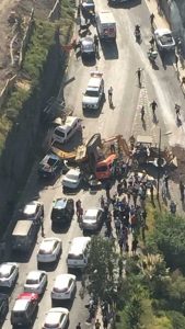 En el puente que construye el Gobierno estatal de dos carriles para darle fluidez al tránsito vehicular de Paseo Interlomas y La Barranca hasta la incorporación con Palma Criolla y Viaducto Bosque Real-Interlomas, cayó la retroexcavadora sobre cinco vehículos.