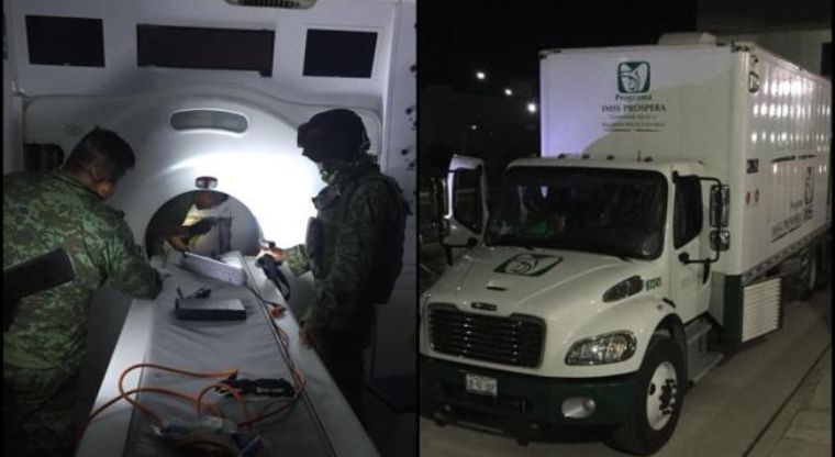 Los paquetes se encontraban ocultos un un tomógrafo, el cual estaba instalado en un camión color blanco con logotipos del IMSS, idéntico a una unidad médica móvil, en el cual viajaban dos hombres y una mujer que aseguraron pertenecer a la Instituto.