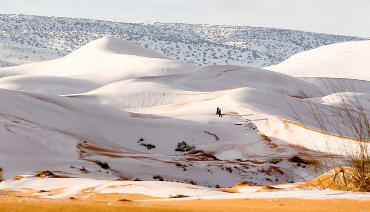 Tras una extraña tormenta, la ciudad de Ain Serfa, en la zona argelina del desierto, apareció cubierta de nieve con un esplendido manto blanco que duró una hora y media, aproximadamente antes de acabar fundido por la implacable arena del lugar. Es cierto que la cordillera del Atlas rodea el lugar y que está a más de 1000 metros de altura, pero ni la temperatura media de la ciudad, que se sitúa en unos 12 grados, ni la media anual de precipitaciones, que es de 169mm, invitaban a pensar que sea un lugar propicio para ver esta estampa.