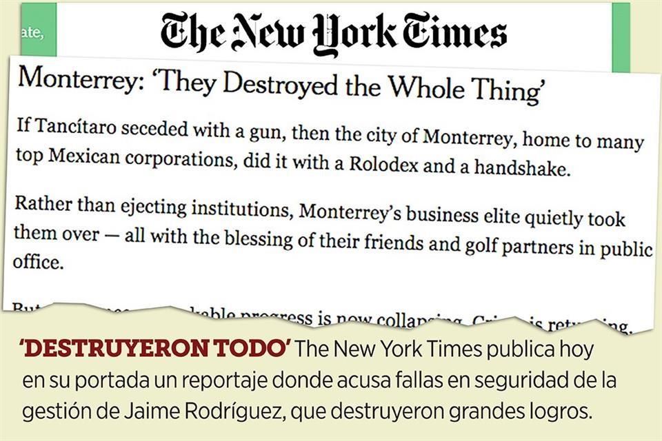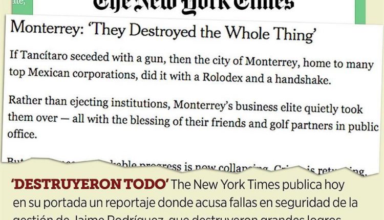 Al designar a amigos en cargos clave y dejar que colapsaran proyectos de seguridad, la Administración del Gobernador Jaime Rodríguez destruyó avances extraordinarios contra el crimen que se habían conseguido en Monterrey, afirmó el periódico The New York Times (NYT).